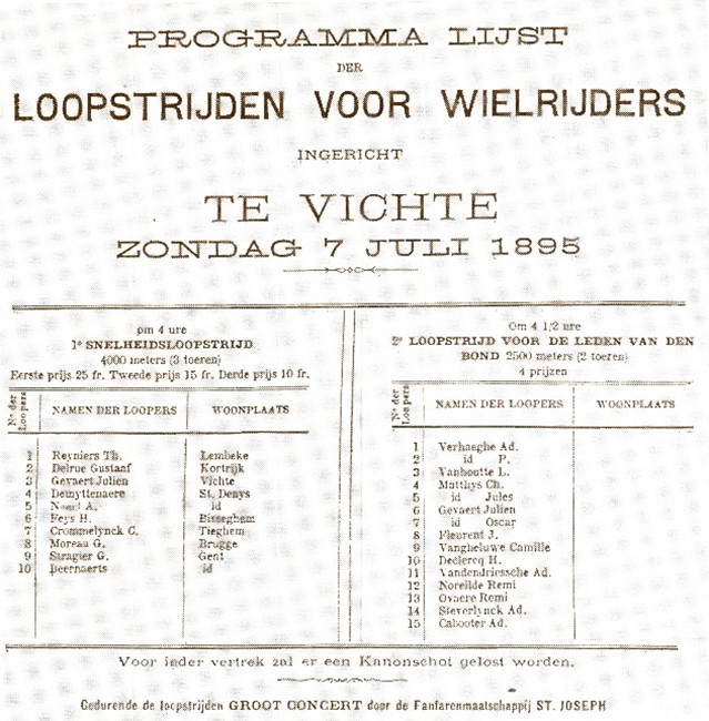 De Vichtse fietsers verenigden zich en richtten er - als éen van de eerste 10 in de provincie – hun eigen wielrijdersbond op. Al heel snel startte de club ook met het organiseren van koersen en op 7 juli 1895 worden er in het plattelandsdorp reeds 2 koersen verreden, waaronder één voor de leden van de wielrijdersbond zelf. Dat de fiets toen voor de "happy few" was, konden we afleiden uit de deelnemerslijst (zie affiche) die exclusief bestond uit notabele (textiel)ondernemers.