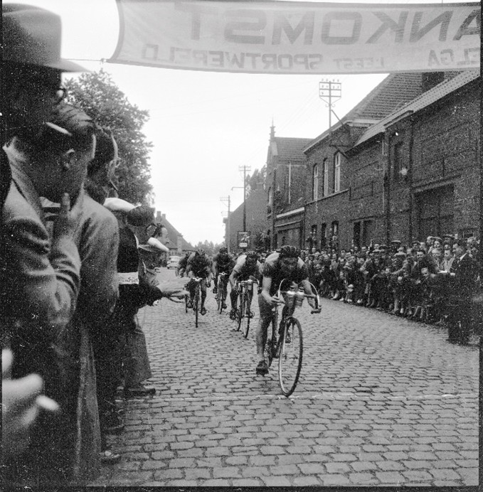 Overwinningsfoto van de Ommegangsprijs 1954 waar Briek Schotte de medestanders kan afhouden op de meet